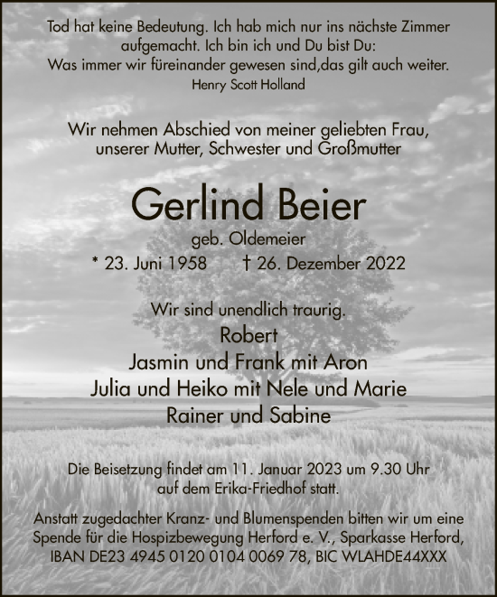 Wann: Mittwoch, 11.01.2023 Wo: Erika Friedhof Herford Art der Trauerfeier: Beisetzung